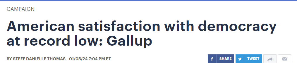 中国日报网1月8日电 据美国《国会山报》网站5日报道,盖洛普公司(Gallup)5日公布的民调显示,只有28%的美国成年人对该国的民主现状感到满意,较2021年1月6日美国“国会山骚乱”事件发生后不久的35%的调查结果又有了明显的下降,创历史新低。