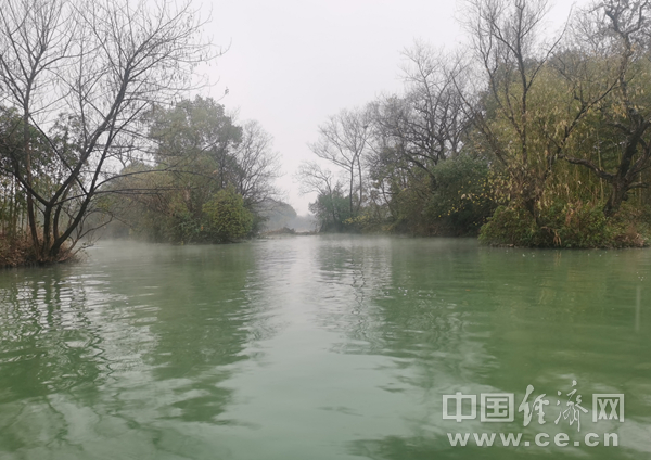 2023年12月18日,西溪湿地国家公园一隅,细雨之中,绿意盎然,水汽袅袅,宛如仙境。(中国经济网记者 武晓娟/摄)