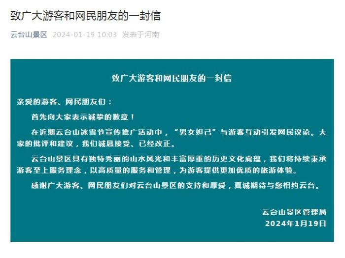 在近期云台山冰雪节宣传推广活动中,“男女妲己”与游客互动引发网民议论。大家的批评和建议,我们诚恳接受、已经改正。