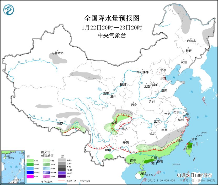 图3 全国降水量预报图(1月21日20时-22日20时)