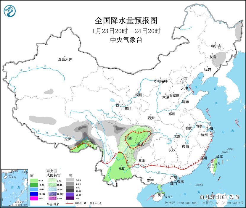 1月23日20时至24日20时,西藏东部、川西高原中北部、四川盆地北部、重庆东部、云南东北部等地部分地区有小到中雪或雨夹雪,其中,西藏东北部、川西高原北部等地局地大雪。四川盆地、云南中东部等地部分地区有小雨。新疆北部、山东半岛等地部分地区有5~6级风,我国东部和南部海域有6~7级风,阵风8~9级(见图5)。