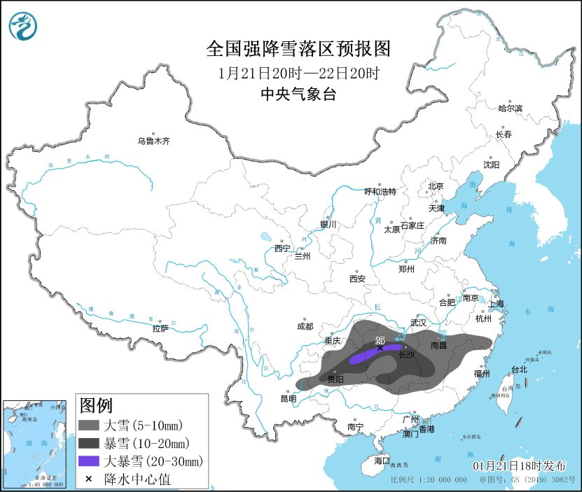 预计1月21日20时至1月22日20时,重庆东部、湖北西南部、贵州、湖南、江西、福建西部和北部、浙江南部、广西北部、广东北部等地的部分地区有大到暴雪,其中,贵州东部、湖南中西部等地局地有大暴雪(20~25毫米),上述部分地区新增积雪深度3~10厘米,局地可达15厘米以上。贵州东南部、湖南西南部、广西北部、广东北部等地局地有冻雨(见图2)。中央气象台1月21日18时继续发布暴雪黄色预警。