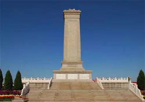人民英雄纪念碑矗立在天安门广场中心,纪念碑分碑身、须弥座和台基三个部分。纪念碑碑身正面镌刻着毛泽东题写的“人民英雄永垂不朽”八个镏金大字,背面镌刻着由毛泽东起草、周恩来题写的碑文。