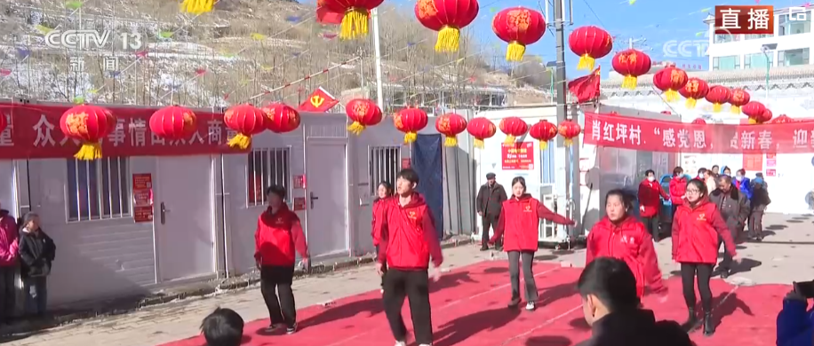 总台记者柴世文:主持人你好,可能大家已经通过我身后的场景看到了,村里这会儿歌舞升平,热热闹闹的。现在正在进行的是肖红坪村的文艺演出,也就是“村晚”。为了今天的日子,村民筹划演练了很长一段时间。村民在文艺爱好者以及大学生志愿者的带领下,彩排了一个星期,并且在小年当天进行了试演,今天终于华丽登场亮相了。今天“村晚”的节目单,有21个节目之多,包含了诗朗诵、歌舞、社火等,虽然表演场地比较简陋,但是对于受灾群众,这是属于他们自己的春晚。