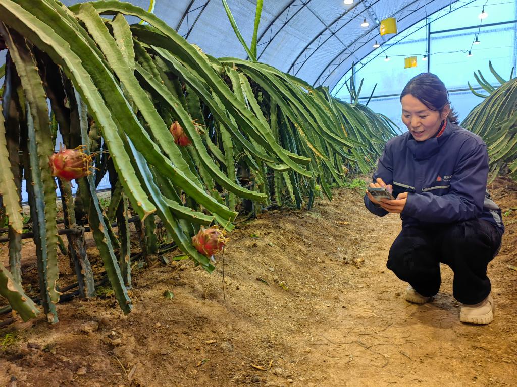 郭娟茹在火龙果大棚内通过物联网技术装备调整室温。 新华社记者孙正好 摄
