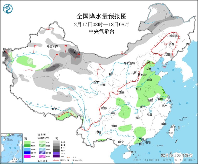 16日至17日,新疆阿勒泰、塔城、伊犁河谷、南疆西部山区等地有大到暴雪,局地大暴雪或特大暴雪;17日至22日,西北地区东部、华北、东北地区、黄淮、江淮、江汉、江南北部和西部等地将先后出现降雪或雨转雪,部分地区有大到暴雪,局地大暴雪;河南、湖北、湖南、贵州将自北向南出现冻雨;黄淮南部、江汉、江淮、江南中北部等地有中到大雨,局地暴雨,并伴有雷暴、短时强降水等强对流天气。
