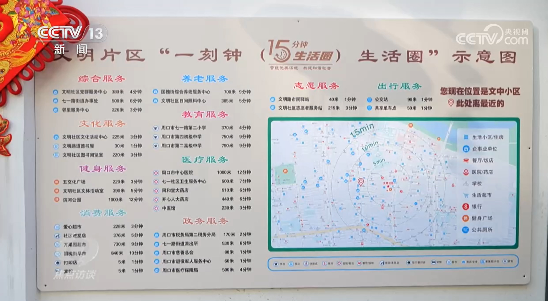 央视网消息(焦点访谈):走出家门,在步行一刻钟的范围内可以做些什么?河南周口市川汇区文明片区的15分钟生活圈地图上可以看到百姓基本生活所需几乎全部覆盖。河南省周口市是农业大市、人口大市,长期以来,这里城市化水平比较低,城市基础设施和公共服务设施建设历史欠账多。川汇区作为城市的老旧小区,遗留问题尤其多。2023年,川汇区在改造老旧小区的同时,着力打造15分钟便民生活圈。经过一系列的措施,现在居民的生活怎样了呢?