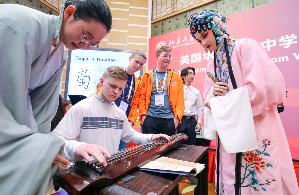 3月20日,在北京大学,中国学生在指导美国华盛顿州中学生代表团的成员弹奏古琴。