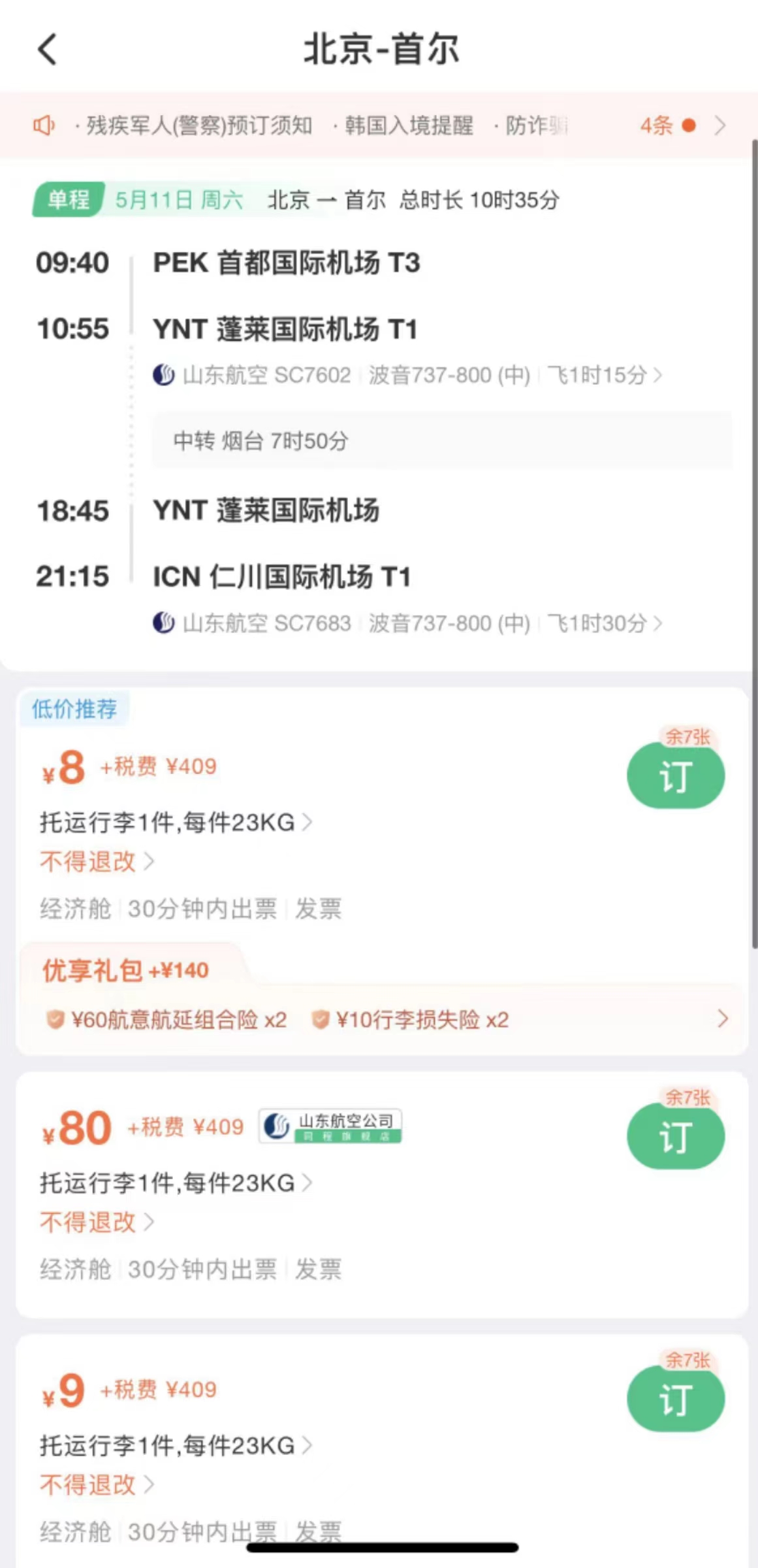 正在阅读:“五一”节后机票大跳水,北京飞首尔不含税机票仅8元
