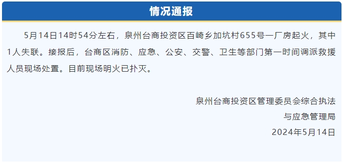 央视网消息:据“泉州台商投资区”公众号消息,5月14日14时54分左右,泉州台商投资区百崎乡加坑村655号一厂房起火,其中1人失联。接报后,台商区消防、应急、公安、交警、卫生等部门第一时间调派救援人员现场处置。目前现场明火已扑灭。