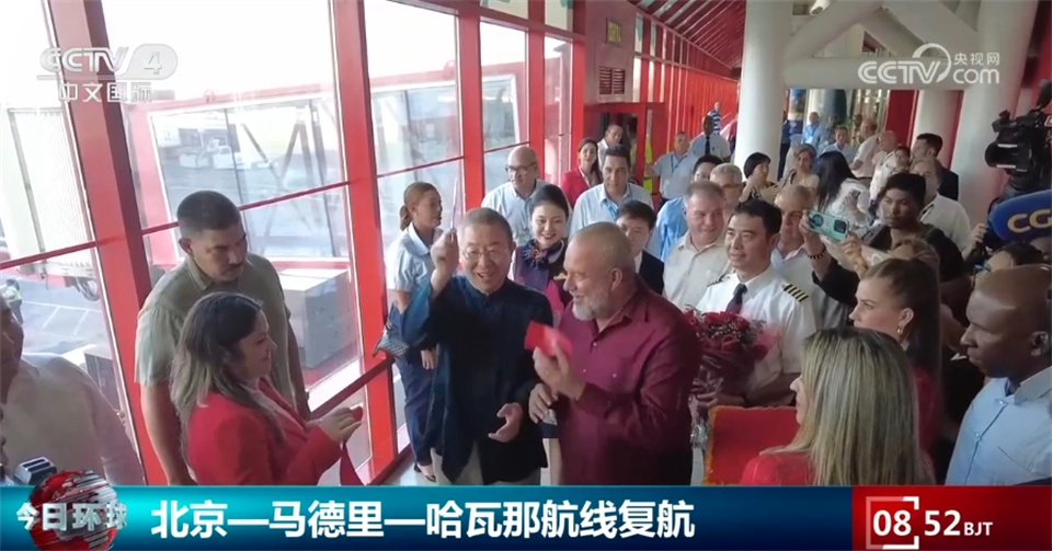 当地时间17日晚,复航后首趟由中国国际航空公司执飞的北京—马德里—哈瓦那直航航班降落在古巴首都哈瓦那何塞·马蒂国际机场。机场举行了水门仪式欢迎航班抵达,古巴旅游部还特别安排,向同机抵达的游客赠送草帽、鲜花等礼物。