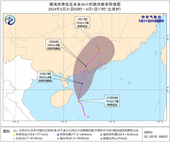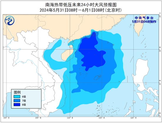 大风预报:5月31日08时至6月1日08时,广东沿海、海南沿海、琼州海峡、南海大部、北部湾将有6~7级大风,南海北部的部分海域和广东中部沿海的风力将有8级,阵风可达9~10级。