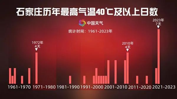 以河北石家庄为例,进入2000年以后出现40℃及以上的高温年份明显增加,其中,2010年出现40℃及以上的高温日数共4天,2023年高达7天。