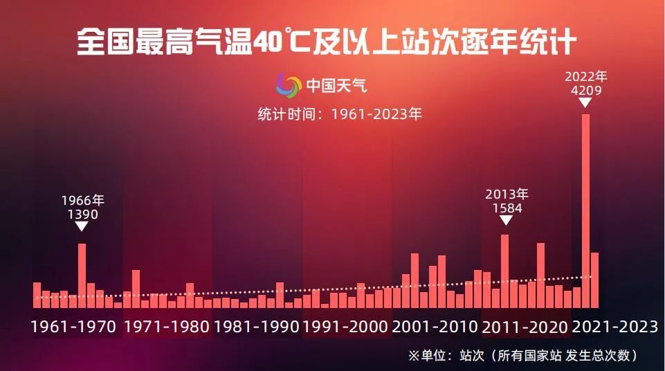 40℃以上的高温真的越来越常见了吗?中国天气网通过盘点1961年至2023年气象大数据发现,这62年中,全国国家级气象观测站出现40℃及以上的高温总体确实呈现增长趋势,其中2022年最多,高达4209站次。