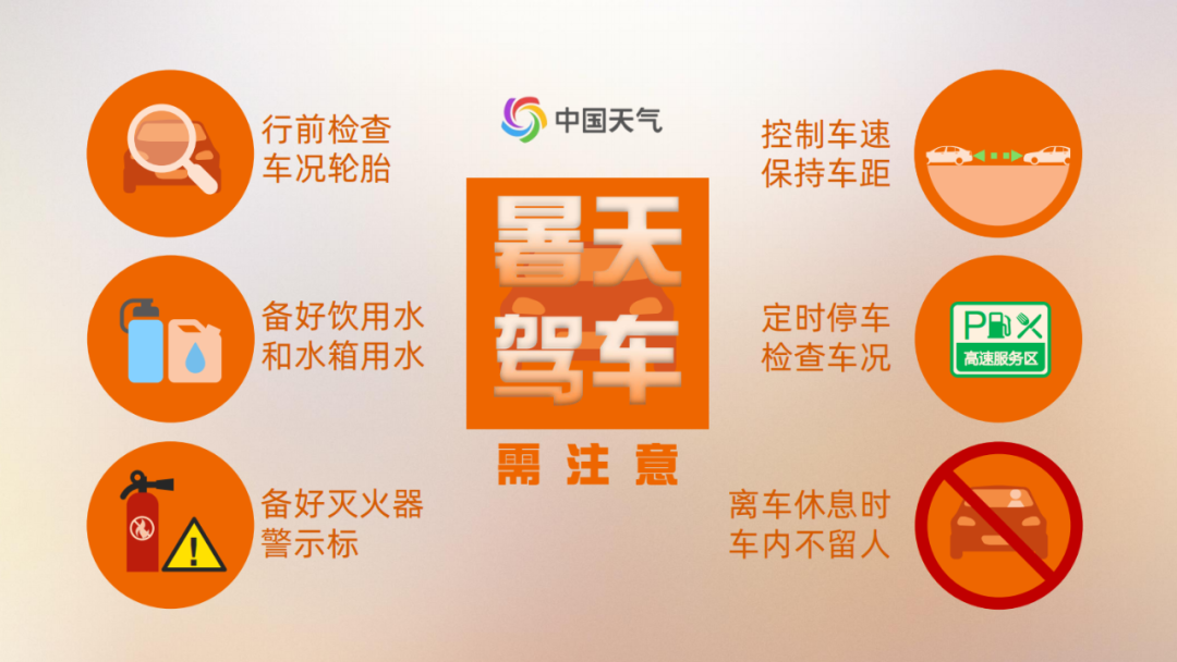 在交通出行方面,随着地表温度升高,户外行车容易发生爆胎、自燃等状况,影响行车安全。当气温≥35℃或者路面温度≥65℃时,爆胎危险性大大增加。行车前要仔细检查车况,备好灭火器、警示标,如果长时间行驶在高速公路上,应定时前往服务区休息,给轮胎降温温。