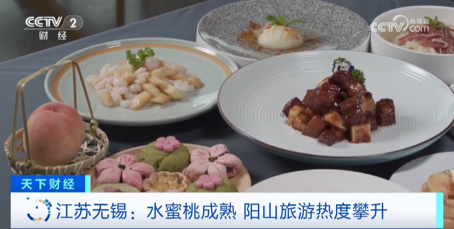 除了直接吃桃子、喝桃子,还可以被做成“桃子宴”。蜜桃咕咾肉、蜜桃火腿丝等创新菜,都是当地人就地取材,以水蜜桃入菜,在创新与融合中,一只只阳山水蜜桃化身为一道道夏日消暑的美味佳肴。