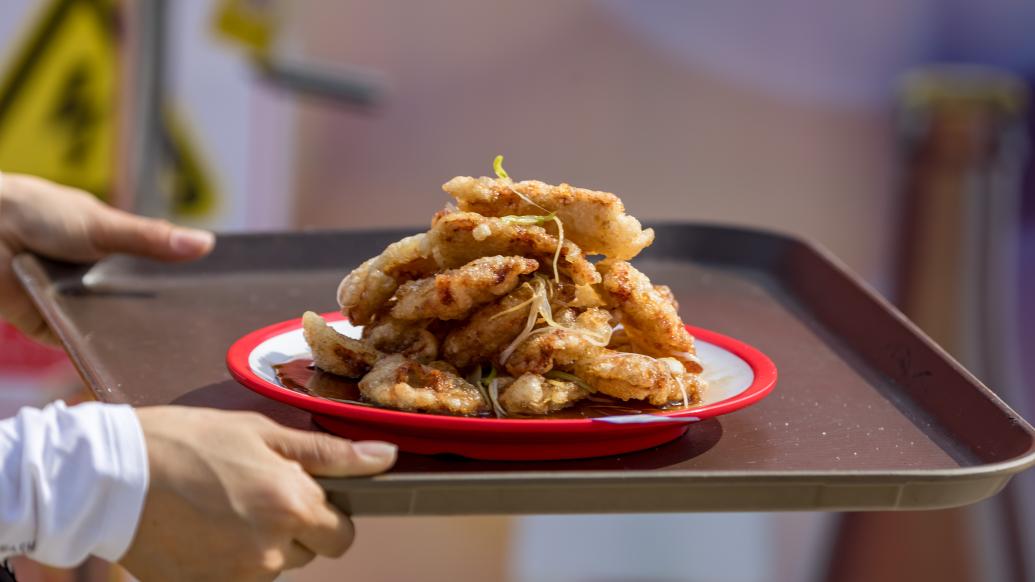 2024年6月29日,吉林省吉林市举办了世界锅包肉大赛,志愿者在端送参赛选手在比赛现场烹制锅包肉给评委。