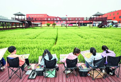 小朋友在浙江嘉兴市余新镇的农田旁采风作画。新华社发
