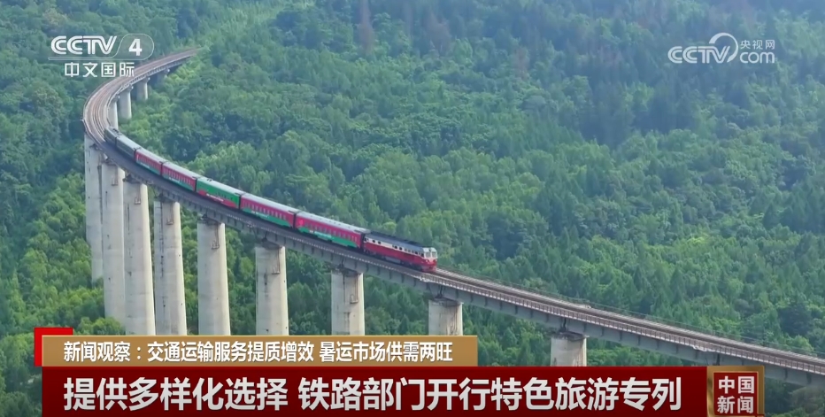 今年暑期,避暑游、亲子游、研学游、毕业游等需求旺盛。铁路部门充分发挥客运和旅游资源优势,结合各地风土人情,通过加开列车、推出特色旅游专列等服务举措,为游客提供了更加便捷、舒适的出行方式。从阿尔山的避暑胜地到新疆的雪山、高原、湖泊等自然景观,旅游专列让游客在旅途中尽情享受中国的大好河山。