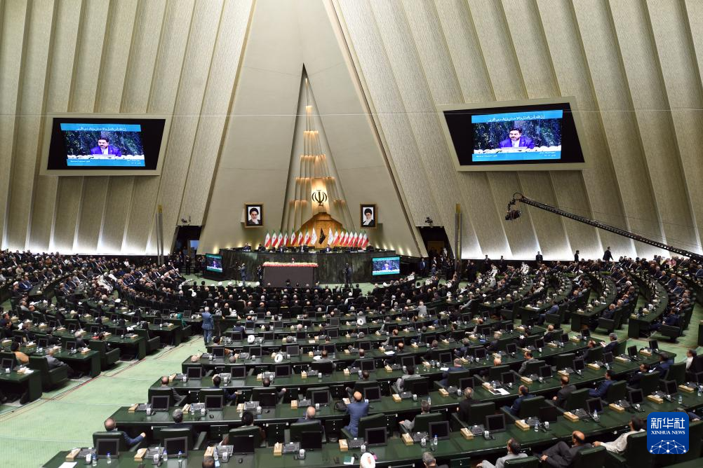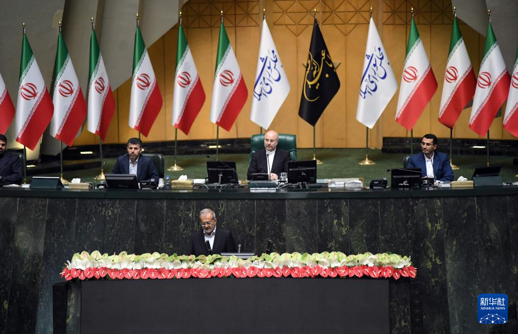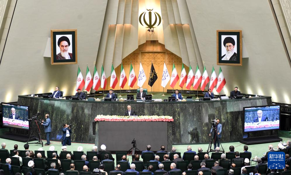 这是7月30日在伊朗德黑兰的伊朗议会拍摄的佩泽希齐扬宣誓就任伊朗总统的典礼现场。新华社记者 沙达提 摄
