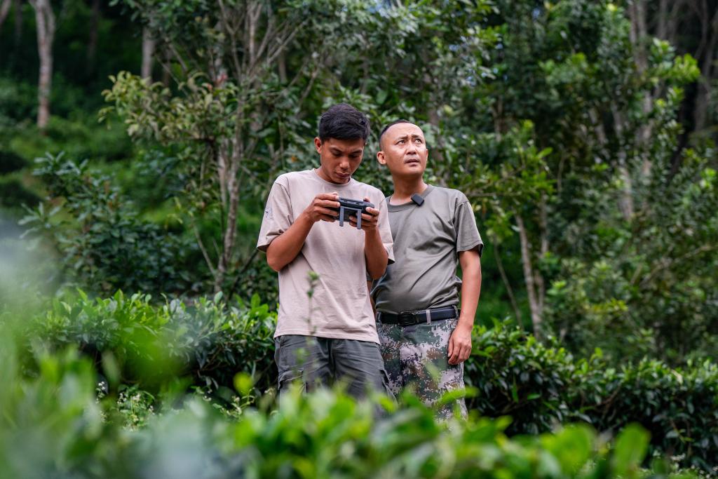 8月10日,亚洲象监测员杨军(右)和同事在使用无人机监测阿宝的行踪。新华社记者 胡超 摄
