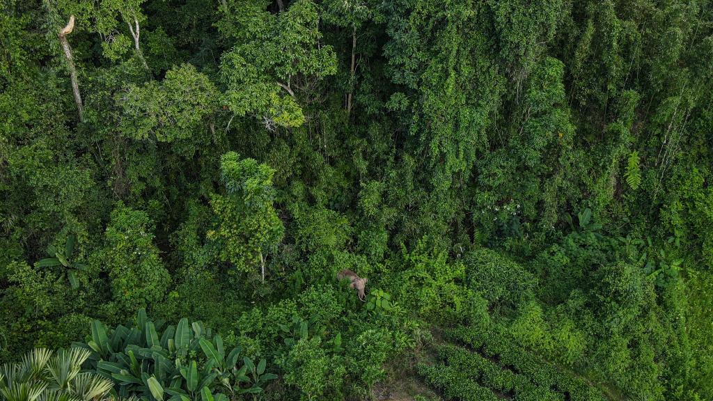 8月9日,在云南西双版纳国家级自然保护区勐养片区边缘,佩戴监测项圈的野象阿宝在山林间穿梭觅食。亚洲象监测员站在不远处,用无人机密切关注着它的一举一动。