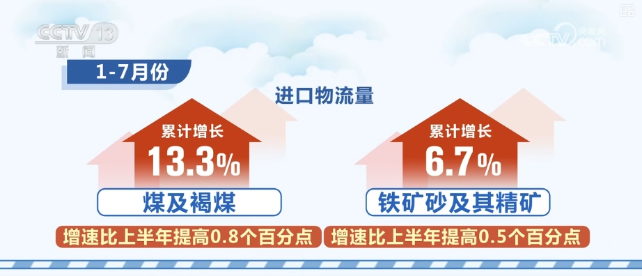从类别来看,部分上游大宗商品进口改善明显。1—7月份,煤及褐煤、铁矿砂及其精矿进口物流量累计增长13.3%和6.7%,增速比上半年分别提高0.8和0.5个百分点。