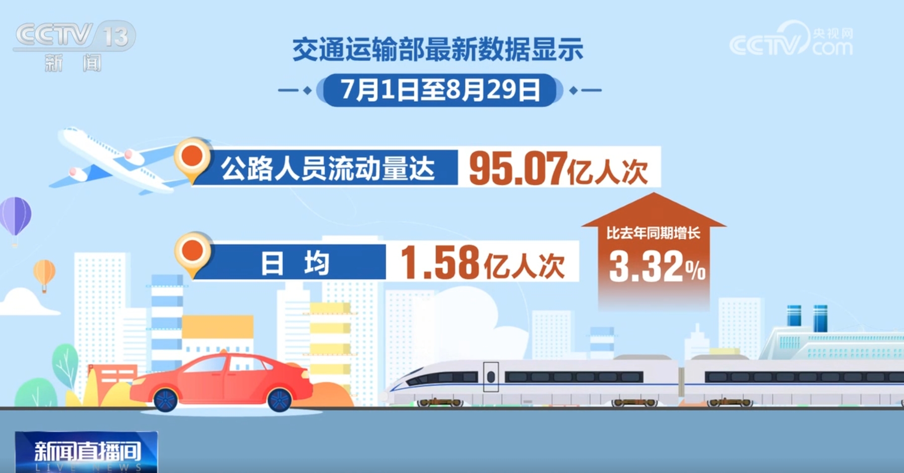 公路人员流动量达95.07亿人次,日均1.58亿人次,比去年同期增长3.32%。