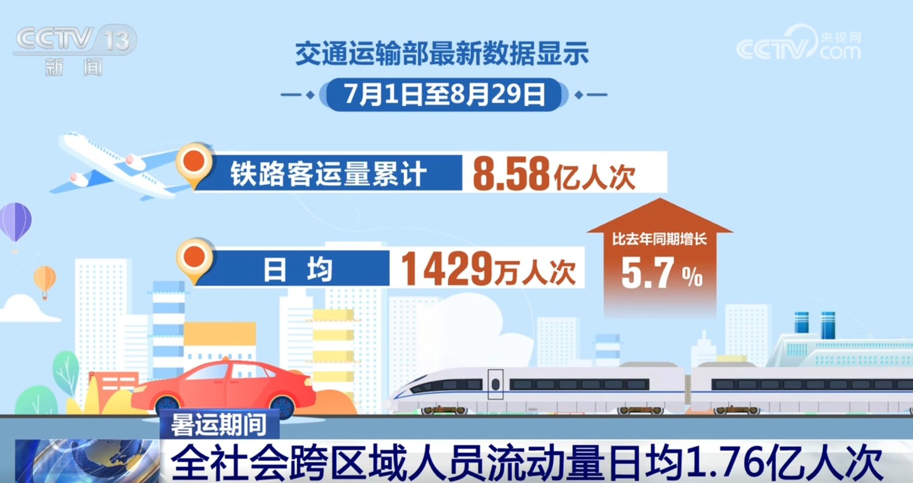其中铁路客运量累计8.58亿人次,日均1429万人次,比去年同期增长5.7%。