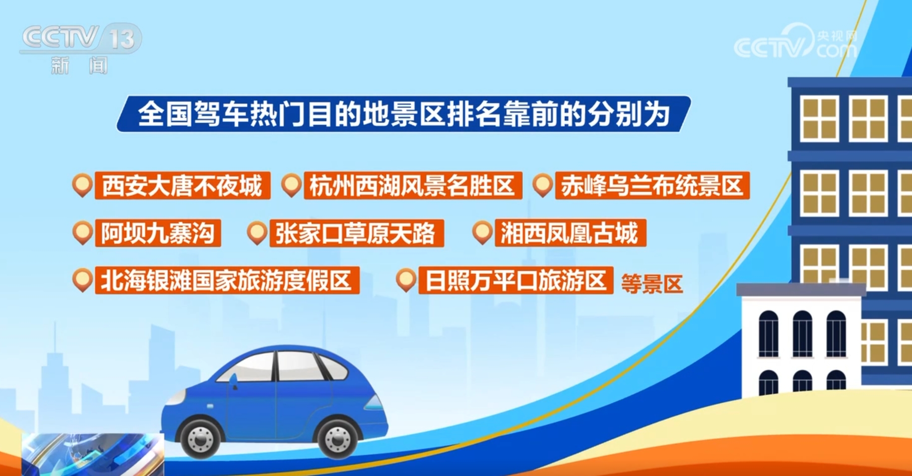 全国驾车热门目的地景区排名靠前的分别为:西安大唐不夜城、杭州西湖风景名胜区、赤峰乌兰布统景区、阿坝九寨沟、张家口草原天路、湘西凤凰古城、北海银滩国家旅游度假区、日照万平口旅游区等景区。