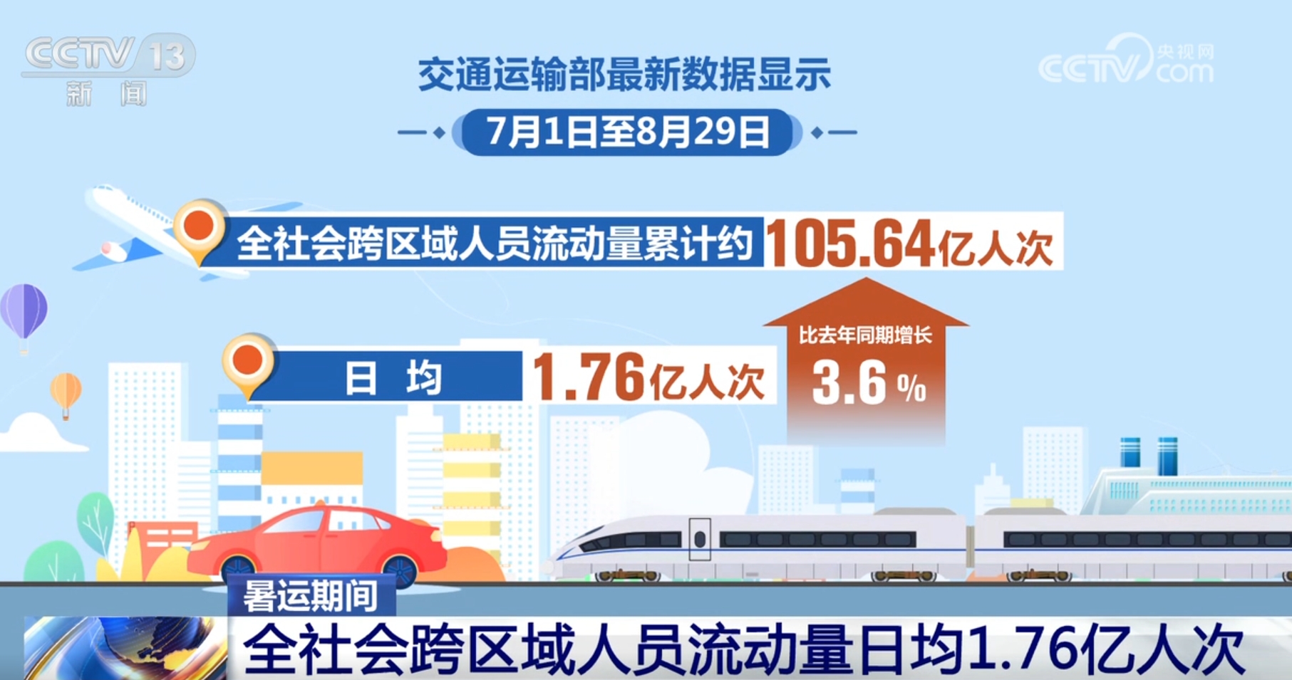 央视网消息:8月31日,为期62天的暑运即将结束,交通运输部发布的数据显示,从7月1日到8月31日暑运期间,全社会跨区域人员流动量日均达1.76亿人次。