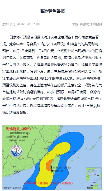央视网消息:国家海洋预报台10月3日16时发布海浪黄色警报:受今年第18号台风“山陀儿”(台风级)和冷空气的共同影响,预计:10月3日夜间到10月4日白天,台湾海峡将出现4到6米的巨浪到狂浪区,东海南部、钓鱼岛附近海域、南海东北部将出现3到4.5米的大浪到巨浪区,近海海域海浪预警级别为黄色;福建近岸海域将出现3到4米的大浪到巨浪,该近岸海域海浪预警级别为黄色,浙江南部近岸海域将出现1.5到2.5米的中浪到大浪,该近岸海域海浪预警级别为蓝色。请在上述海域作业的船只注意安全,沿海各有关单位提前采取防浪避浪措施。48小时预报:10月4日夜间,台湾海峡将出现3到4.5米的大浪到巨浪区;福建北部近岸海域将出现2到3米的中浪到大浪,近岸海域海浪预警级别为蓝色。预计5日早晨解除此次海浪警报。