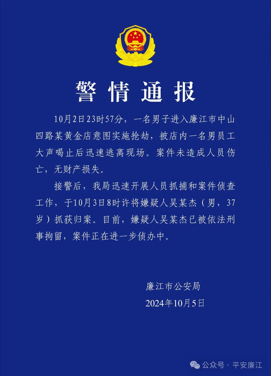 央视网消息:据平安廉江官微消息,广东廉江市公安局10月5日通报,10月2日23时57分,一名男子进入廉江市中山四路某黄金店意图实施抢劫,被店内一名男员工大声喝止后迅速逃离现场。案件未造成人员伤亡,无财产损失。接警后,公安局迅速开展人员抓捕和案件侦查工作,于10月3日8时许将嫌疑人吴某杰(男,37岁)抓获归案。目前,嫌疑人吴某杰已被依法刑事拘留,案件正在进一步侦办中。