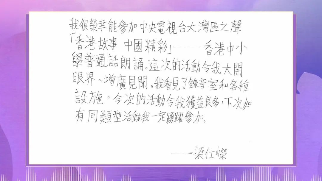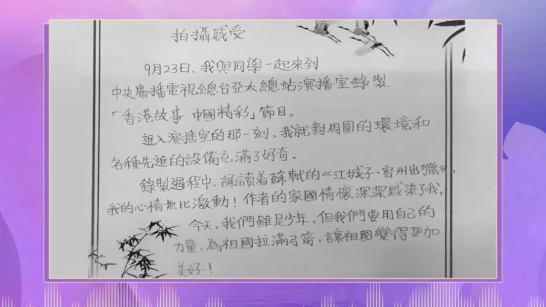 “香港故事 中国精彩”活动开展以来,活动组委会收到了多家学校的热情投稿。在这些真挚的文字中,我们择优邀请了部分同学到中央广播电视总台亚太总站演播室和大湾区之声直播间进行表演录制。今天的展播,我们就来分享其中的两个作品。