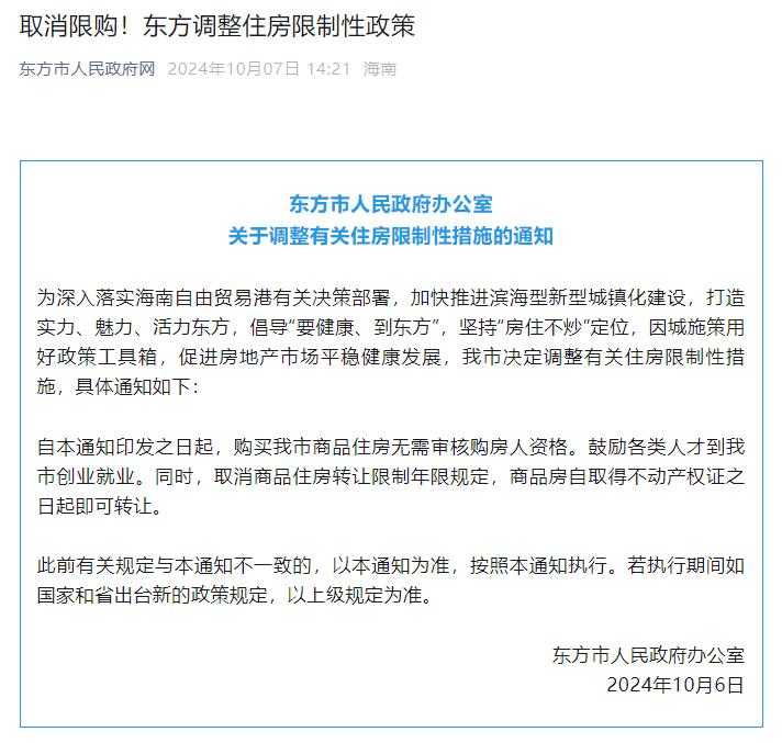 央视网消息:海南省东方市人民政府办公室10月6日发布通知称,自本通知印发之日起,购买我市商品住房无需审核购房人资格。鼓励各类人才到我市创业就业。同时,取消商品住房转让限制年限规定,商品房自取得不动产权证之日起即可转让。