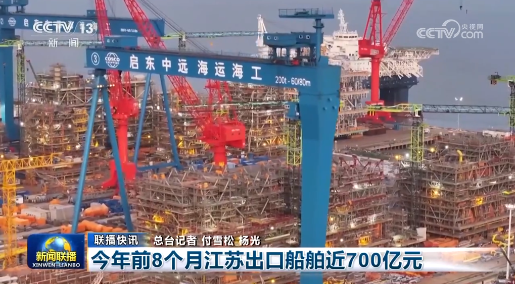 据南京海关统计,今年前8个月,江苏出口各类船舶692.7亿元,居全国首位,同比增长75.1%。其中,民营企业船舶出口296.5亿元,占比超四成。