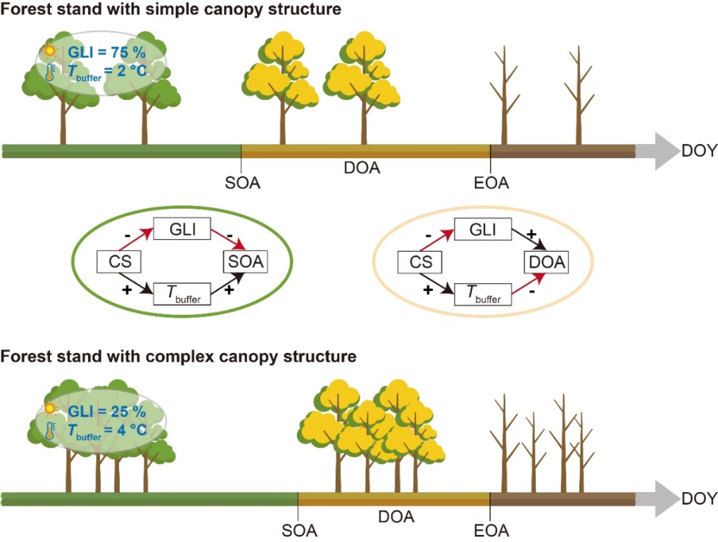 中国科学院植物所研究员苏艳军说,冠层结构主要通过调节林内辐射和温度等微气候因子影响秋季物候。“复杂的冠层结构一方面可以削弱林内光照,降低光合作用强度,延缓植物达到‘碳饱和’的时间;另一方面可通过增强温度的缓冲作用,减缓冷积温的累积速度,降低植物遭受霜冻的风险。这些都可能推迟秋季物候的到来。”