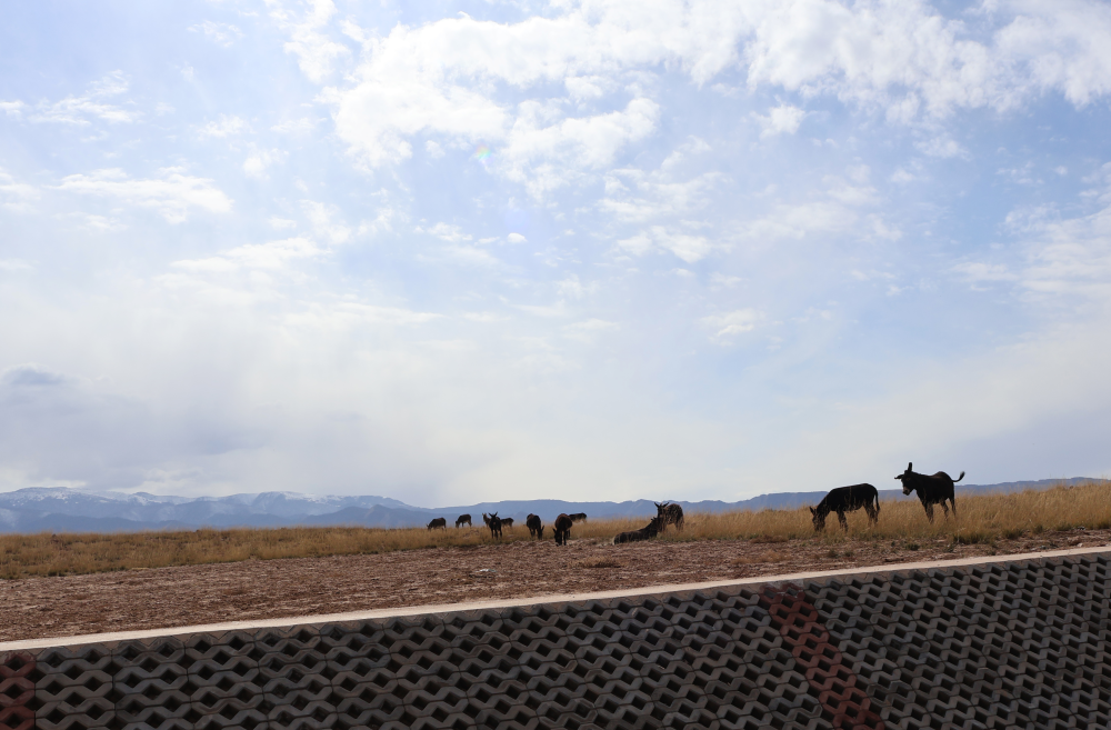 16日,焉支山下,几头毛驴正悠闲地觅食。新华社记者 刘雅萱 摄
