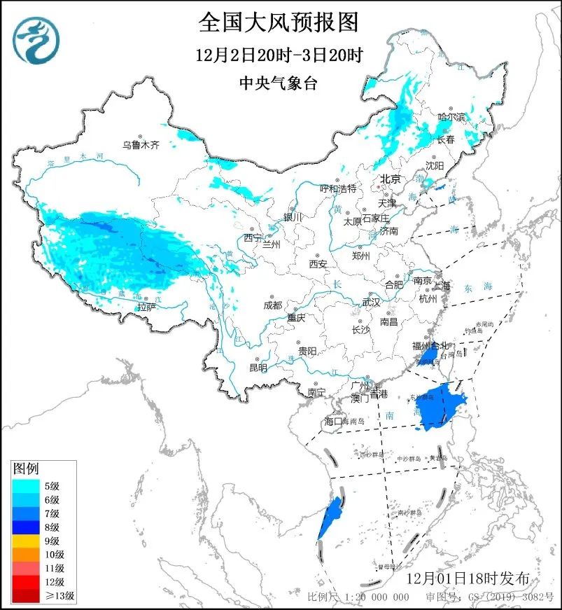 12月2日20时至3日20时,西藏北部和西部、内蒙部东部、甘肃北部、吉林西部等地将有5~6级、阵风7~8级风;台湾海峡、巴士海峡、南海东北部海域将有7~8级、阵风9级的大风。
