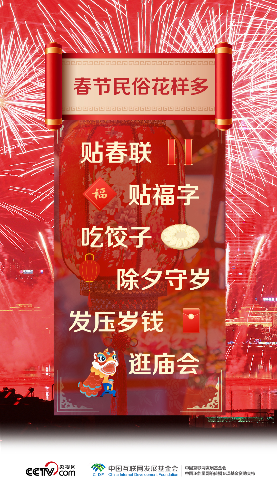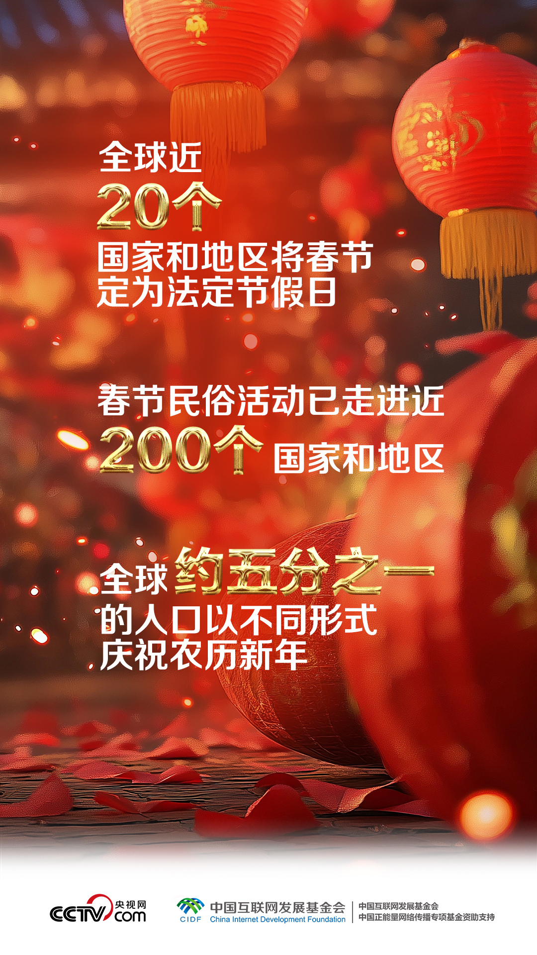 春节体现了中华民族和中华文明和平、和睦、和谐的价值追求。如今,世界有近20个国家将农历新年定为法定节假日,全球约五分之一的人口以不同形式庆祝农历新年。春节不仅成为全球文化盛事,更成为世界普遍接受、认同和欣赏的中华文化符号。