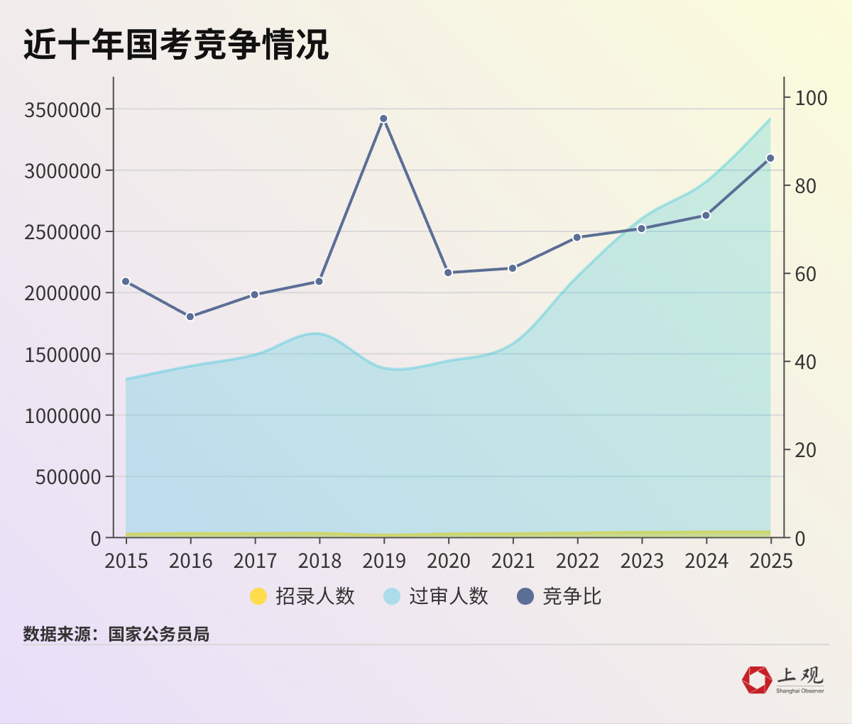 2025年国考共计划招录3.97万人,截至网上报名与资格审查工作结束,共有341.6万人通过了资格审查,今年的竞争比(即通过资格审查人数与录用计划数之比)为86:1。