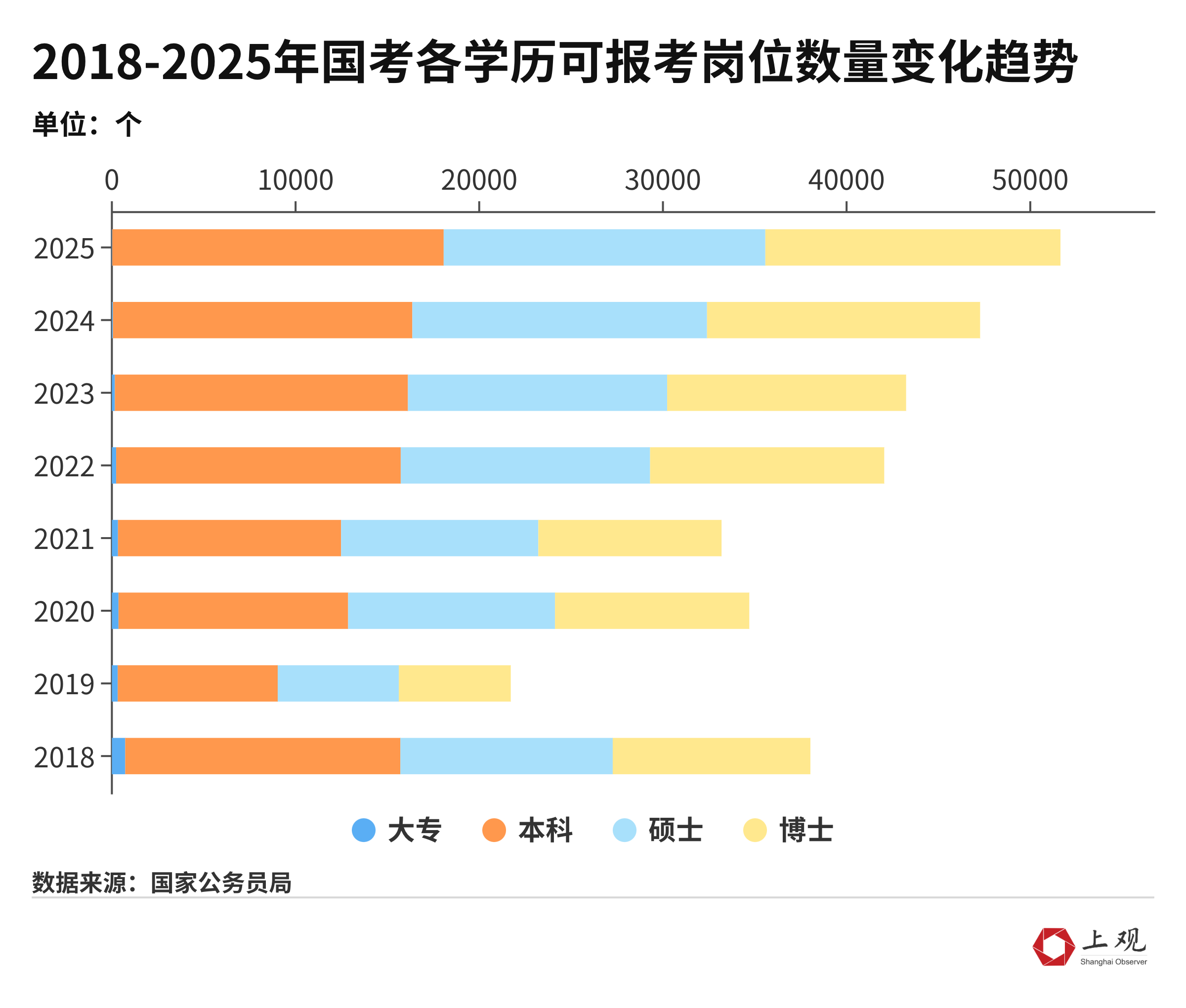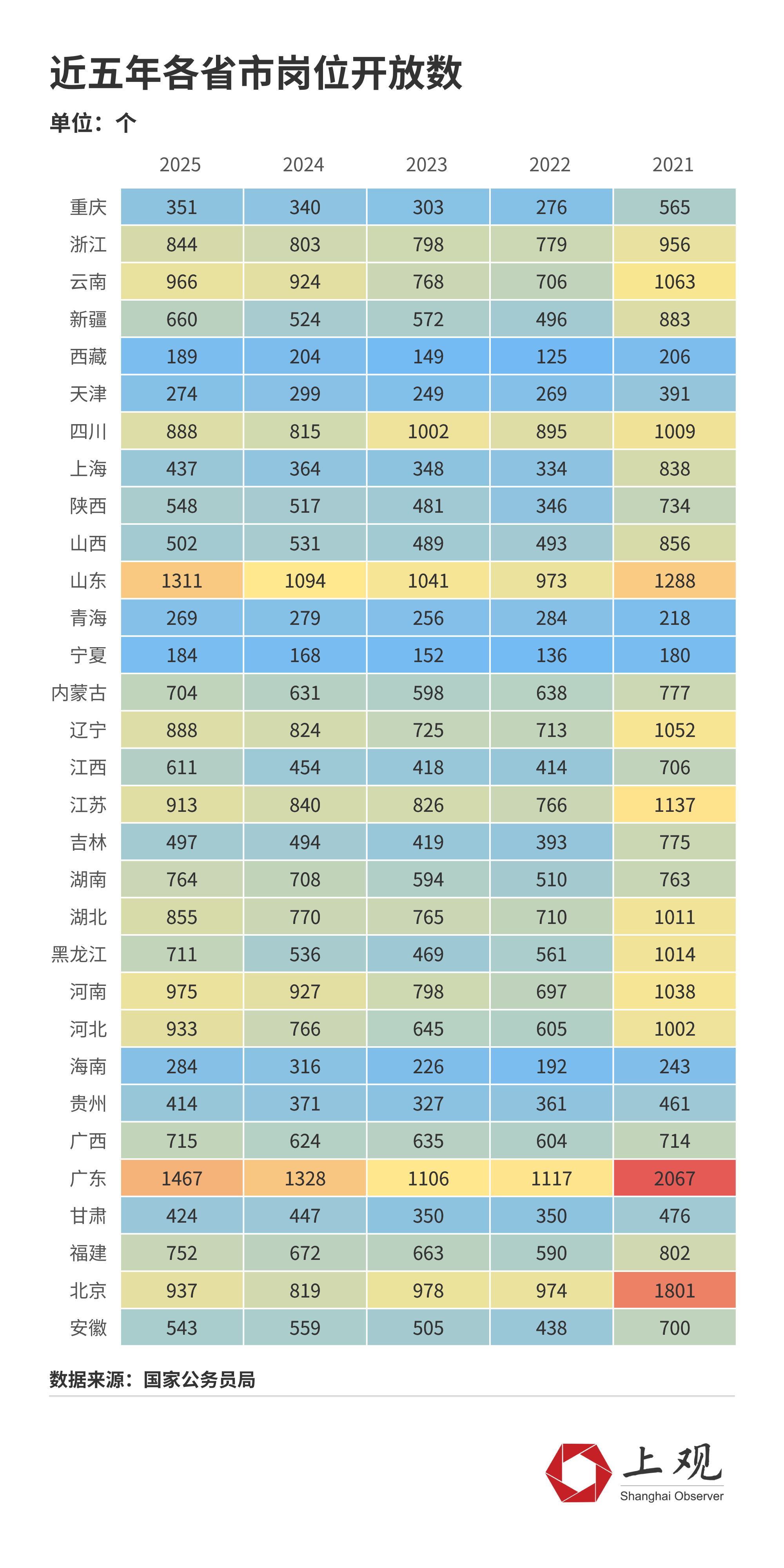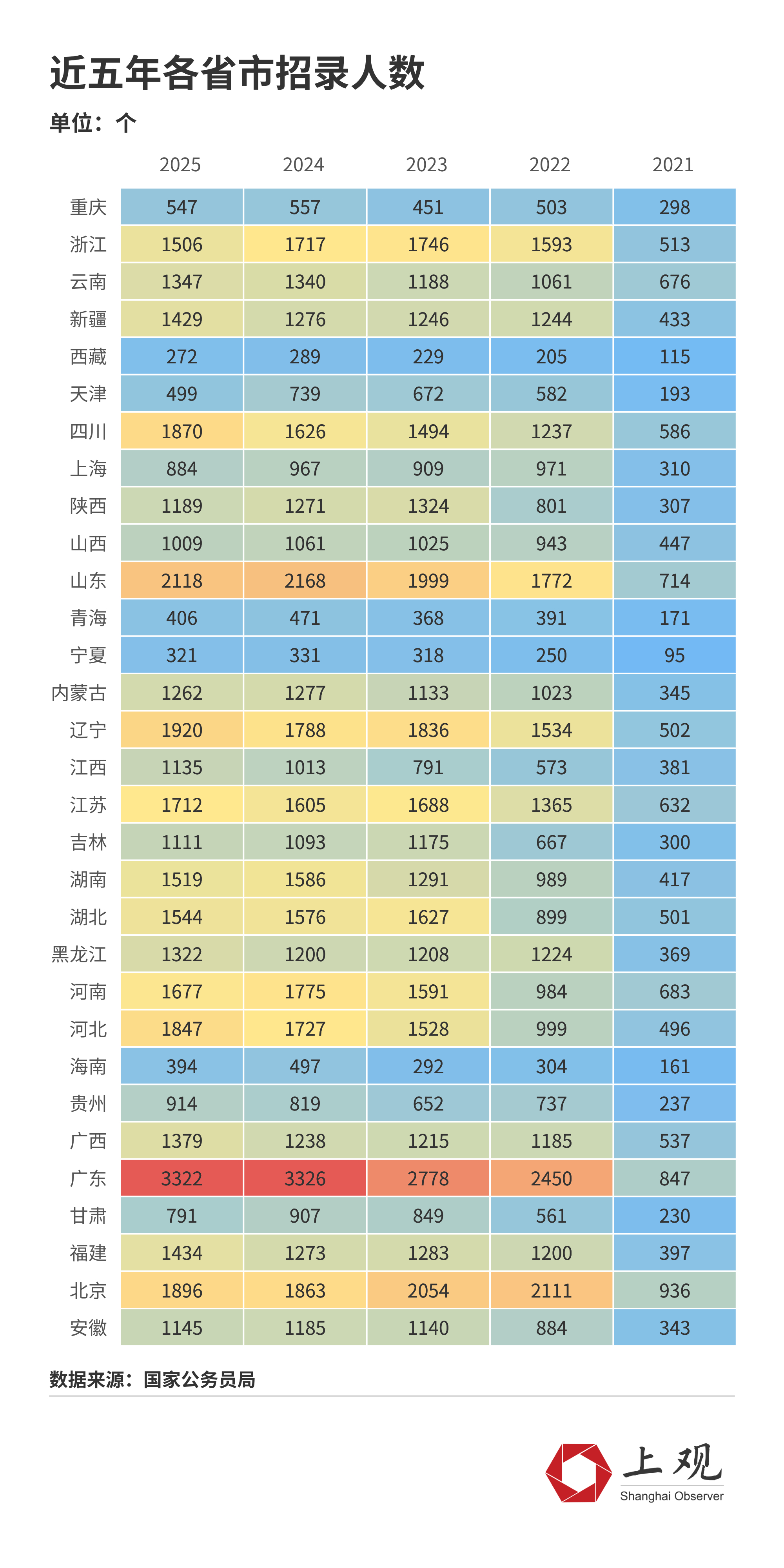 总体来看,相较于2021至2022年,2023至2025年的国考招录人数增长更为缓慢,且部分省市开始出现招录人数缩减的情况。