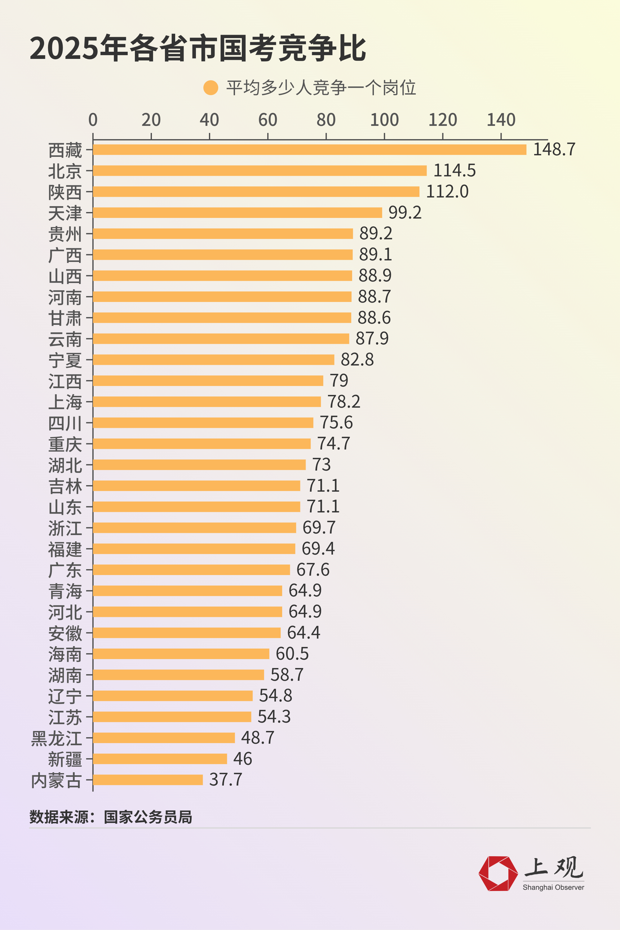 西藏、北京、陕西是国考竞争最强劲的。西藏每一个岗位平均有148.7人在竞争。北京、陕西则分别有114.5和112人。竞争最小的几个省份是内蒙古、新疆和黑龙江。从全国来看,上海的国考竞争不算最激烈,平均每个岗位有78.2个人竞争。