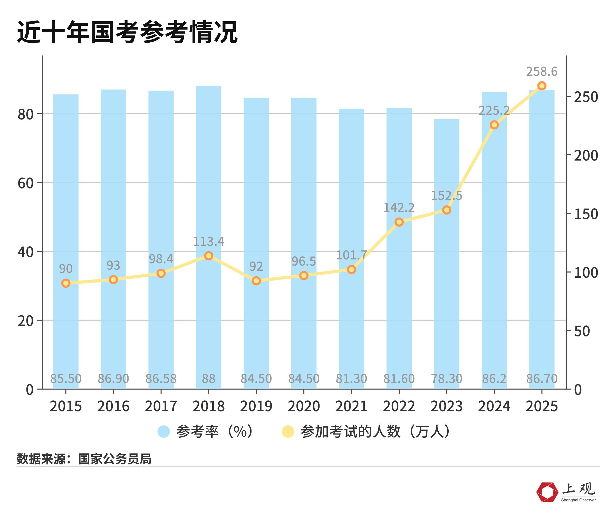 刚刚过去的中央机关及其直属机构2025年度考试录用公务员公共科目笔试(简称国考),共298.2万名考生考前进行了报名确认、258.6万人实际参加考试,参考率约为86.7%,为近年来最高。