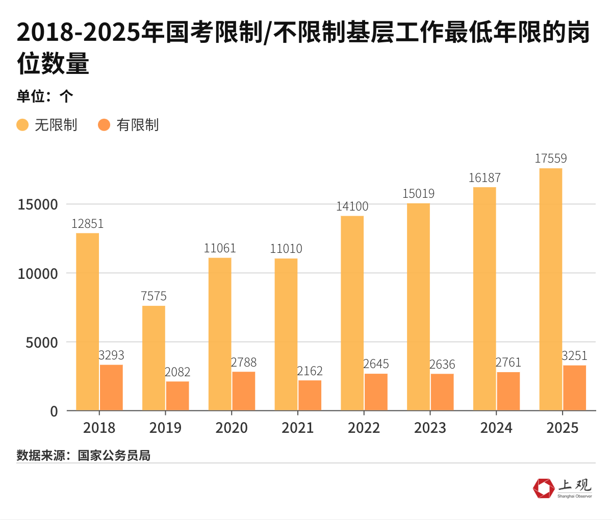2022年以来,国考向应届生倾斜的趋势明显,计划招收应届生比例保持在2/3左右。2025年国考近7成计划招应届生,还有约84.5%的岗位不限制基层工作最低年限。