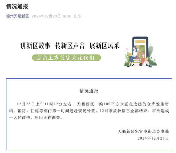 央视网消息:山东德州天衢新区宋官屯街道办事处通报,12月23日上午11时12分左右,天衢新区一约100平方米正在改建的仓库发生坍塌,消防、住建等部门第一时间赶赴现场处置,12时事故救援已全部结束。事故造成一人轻微伤,原因正在调查。