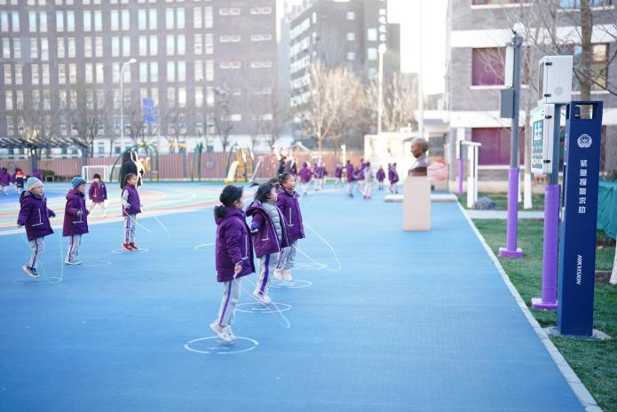 在北京市西城区奋斗小学北校区,学生们参与课间活动。(受访者供图)
