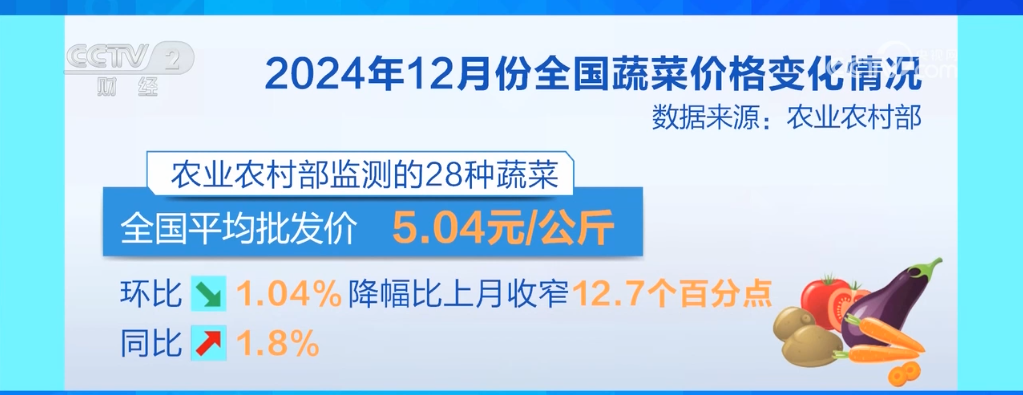 2024年12月份,农业农村部监测的28种蔬菜全国平均批发价为每公斤5.04元,环比下降1.04%,降幅比上月收窄12.7个百分点,同比上涨1.8%。分品种看,环比价格12种上涨、16种下降,其中,西红柿、芹菜价格降幅超过10%。