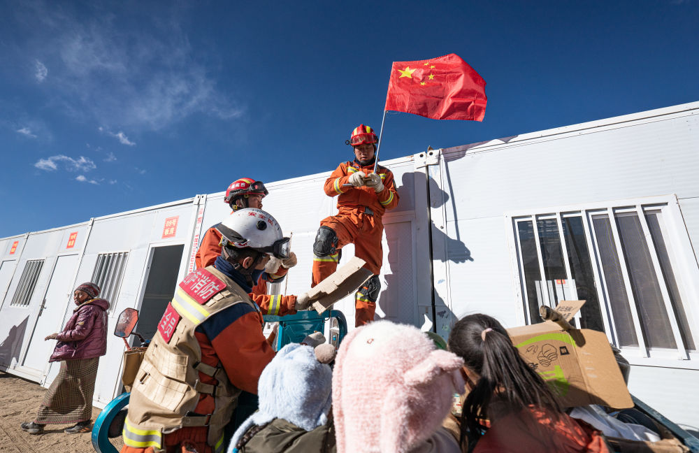 在定日县措果乡野江村,消防员在活动板房上安置国旗(1月13日摄)。(新华社记者 丁增尼达 摄)