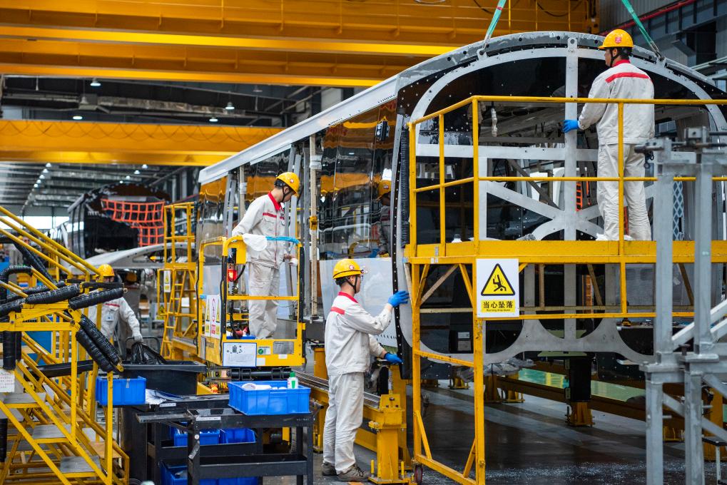 2024年11月18日,在位于安徽省芜湖市的中车浦镇阿尔斯通运输系统有限公司内,工人在无人驾驶轨道列车生产线上作业。新华社发,肖本祥摄